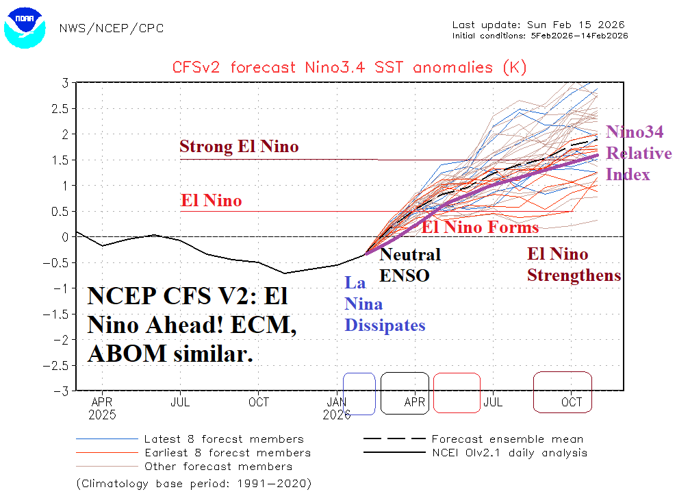Fig. 3: The dynamic models forecast of Nino34 SSTA, including NCEP CFS V2, remain aggressive developing a mid-year El Nino which intensifies later this year. Note the (new) relative Nino34 SSTA index is not quite as strong because long-term oceanic warming is removed.